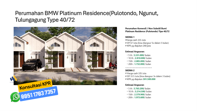 Perumahan BMW hadir sebagai terpercaya, nyaman, dan sesuai regulasi, maka Perumahan BMW layak jadi pilihan. Lokasinya strategis di Kecamatan Pakel, Bangunmulyo, Tulungagung dan tersedia tipe subsidi maupun komersil.