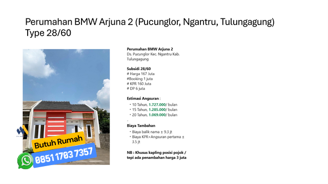 Jika Anda mencari hunian yang terpercaya, nyaman, dan sesuai regulasi, maka Perumahan BMW layak jadi pilihan. Lokasinya strategis di Kecamatan Boyolangu, Wajak Lor, Tulungagung dan tersedia tipe subsidi maupun komersil.