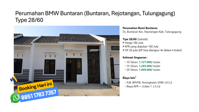 Perumahan BMW hadir sebagai terpercaya, nyaman, dan sesuai regulasi, maka Perumahan BMW layak jadi pilihan. Lokasinya strategis di Kecamatan Kedungwaru, Ngujang, Tulungagung dan tersedia tipe subsidi maupun komersil.