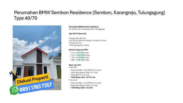 Perumahan BMW hadir sebagai legal dan cocok untuk keluarga, maka Perumahan BMW layak jadi pilihan. Lokasinya strategis di Kecamatan Boyolangu, Ngranti, Tulungagung dan tersedia tipe subsidi maupun komersil.